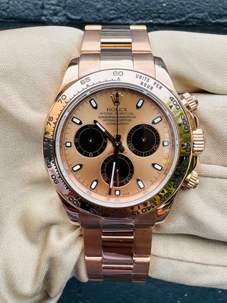 - Color: Rose Gold with black subdials