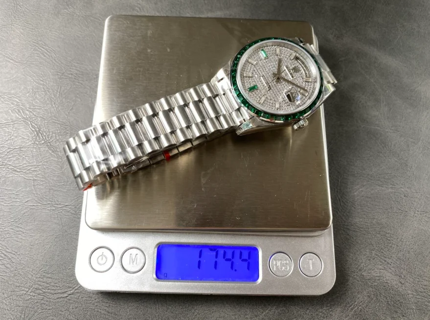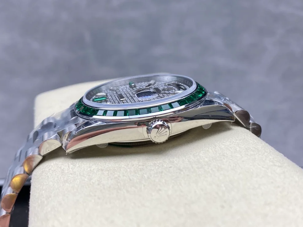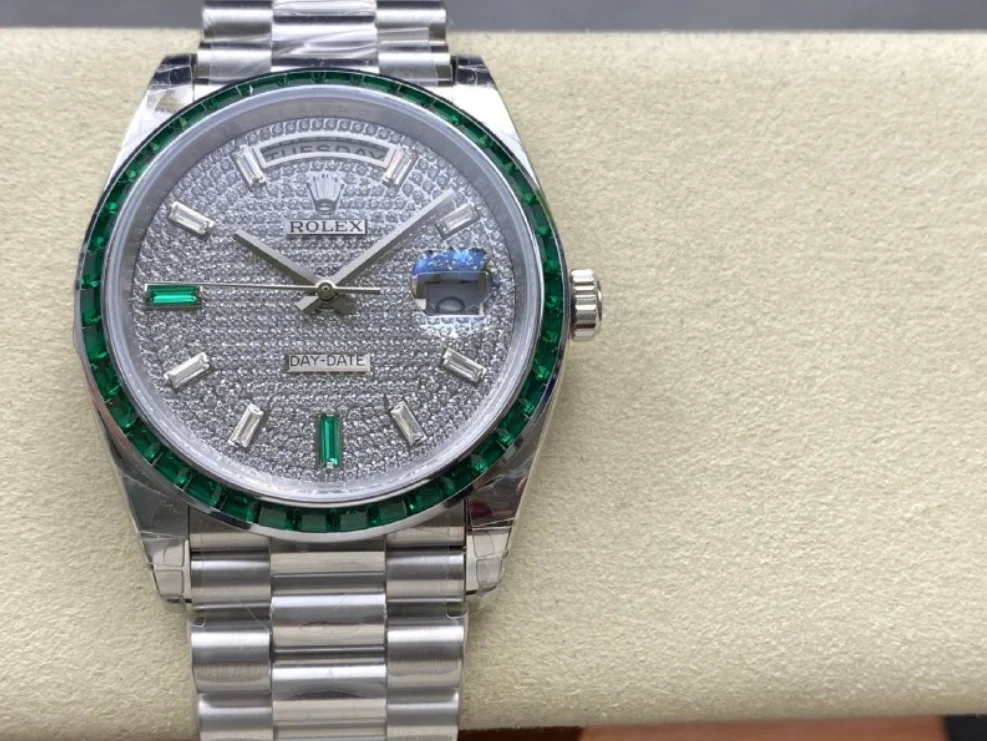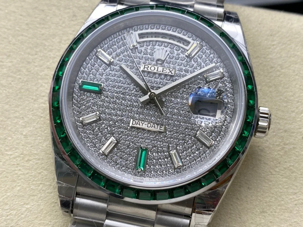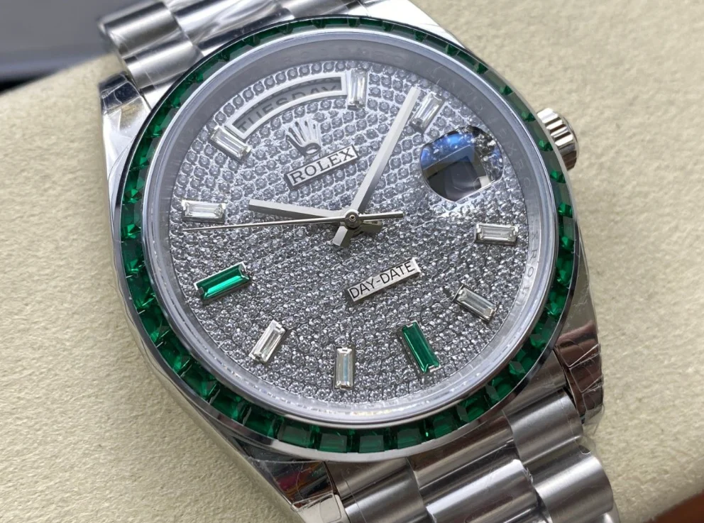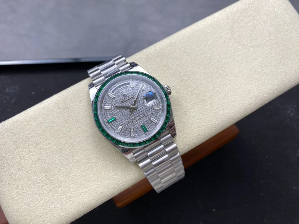 - Markers: Green Moissanite Diamonds Index at 6 and 9 o’clock