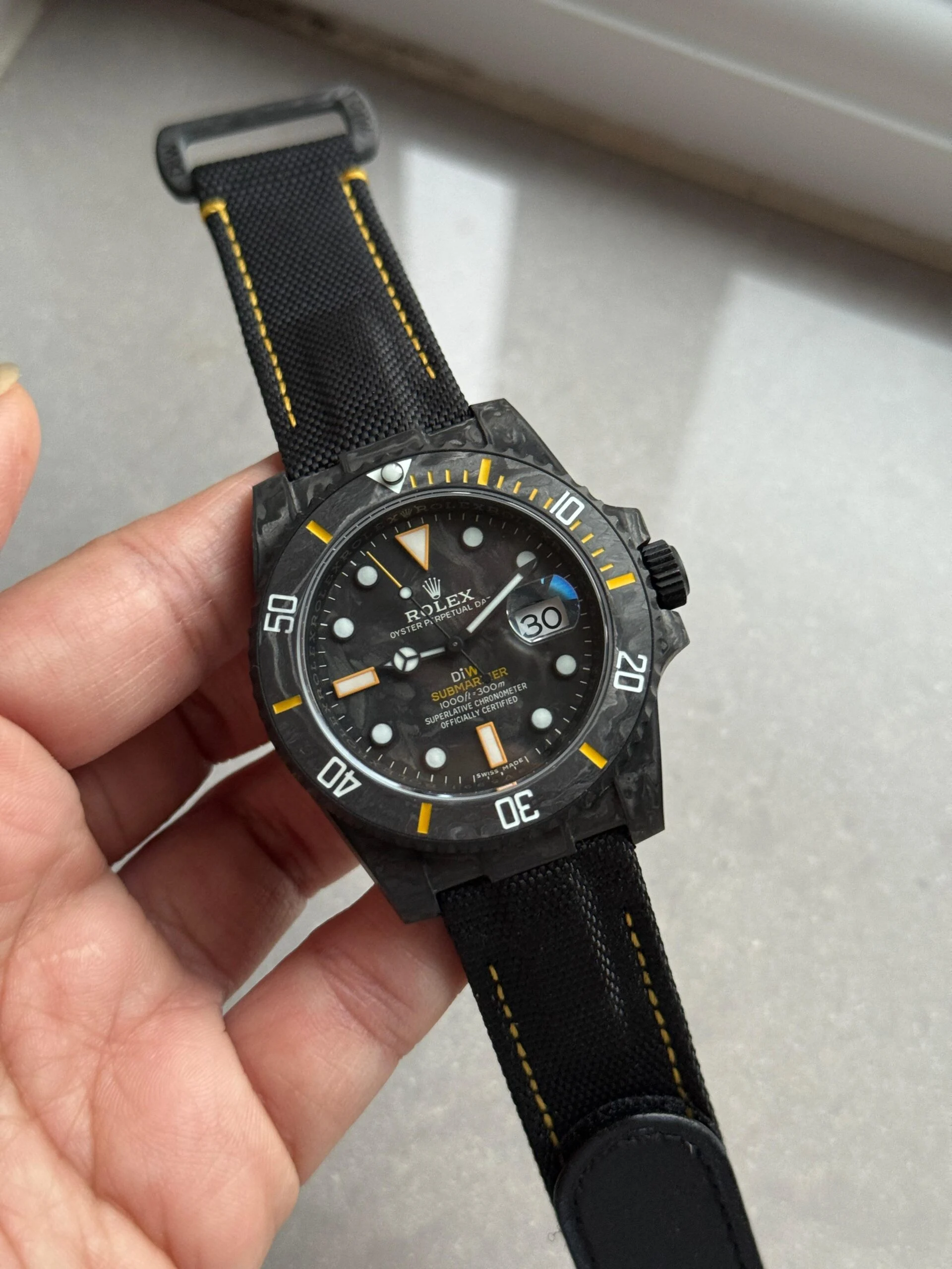 Submariner DIW Carbon VSF 1:1 Best Edition Black/Yellow Dial on Black Nylon Strap Super Clone